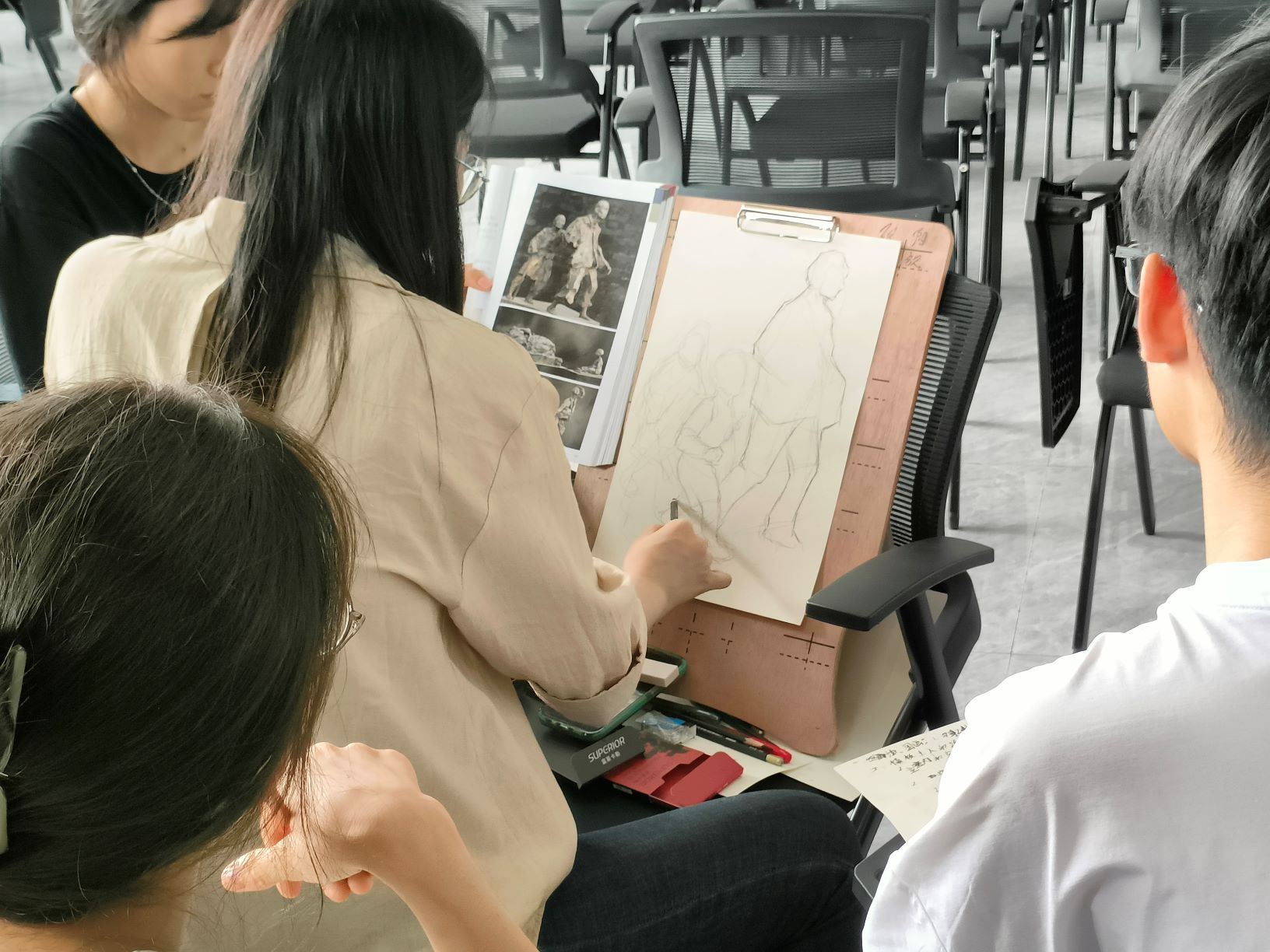 苏环老师一边示范一边讲解审题方法、画速写的步骤、评分标准等知识点,同学们认真听讲、做笔记,在苏环老师示范的同时,同学们也跟着画,做到活学活用,把课堂上的知识点记住,及时复习。